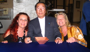 Hier sehen Sie Dr. Emoto mit der Grafikerin Karin Spreitzer und Burgi Sedlak, die alle seine Vorträge in